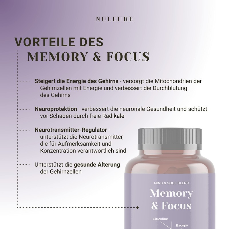 - Functional formula: Memory Focus is a nootropic that supports healthy brain function and promotes memory and concentration through the positive properties of citicolin, ginkgo, bacopa, ginseng, zinc, vitamin B12, vitamin B6 and folic acid.