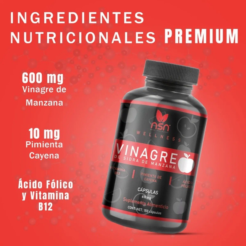 Cada cápsula contiene 600 mg de vinagre de manzana, 10 mg de pimienta cayena, 120 mcg de ácido fólico y 1.2 mcg de vitamina B12, pudiendo ajustar la dosis a 3 cápsulas diarias o más según necesidades individuales.