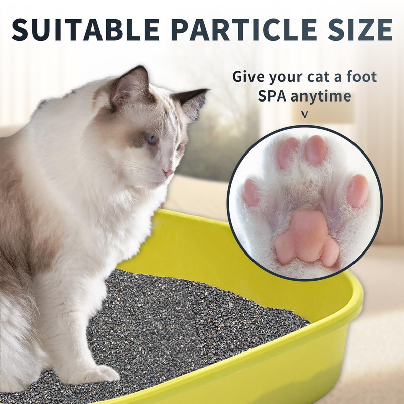 • ✅ Natural Raw Mineral – Deeply mined raw stone, original particles of mineral sand,the original ore was directly broken into irregular particles, the crushing process to filter the dust, fine particles, more original foot feel, ideal for comfortable feet, moderate particles do not get stuck in the claws, desert-level foot feel cats like more!