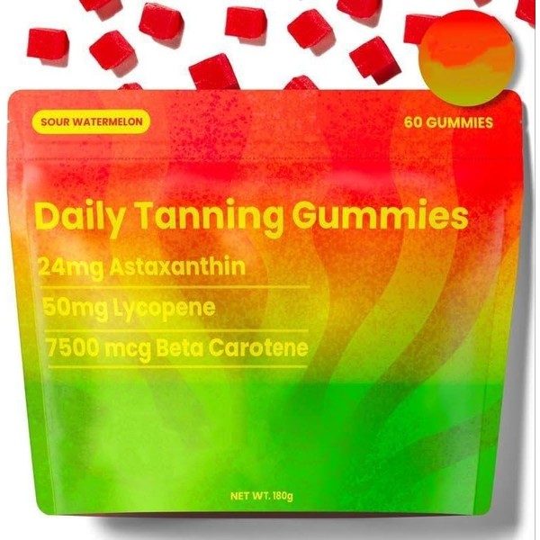 Natural Tanning Gummies with Astaxanthin 24mg, Lycopene 50mg & Beta Carotene 7500mcg – Skin Health & Glow Support Supplement – Watermelon Flavor – 60 Gummies