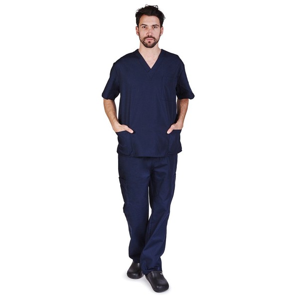 - 3 Pocket Top - Side Slits with Set-In Sleeves, Two Cargo Pockets, Cell Phone Pocket, Scissor Pocket on Right Leg, One Chest with Two Lower Pockets, Back Elastic Front Drawstring Pants, Natural-rise, Tapered Legs Scrub Pants with a 30" Inch Inseam Men's Medical Scrub Sets