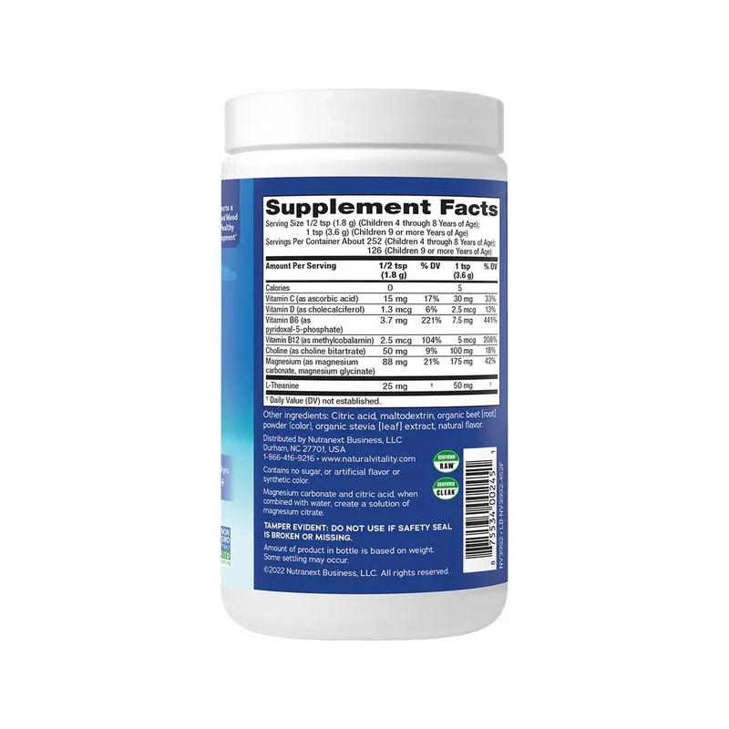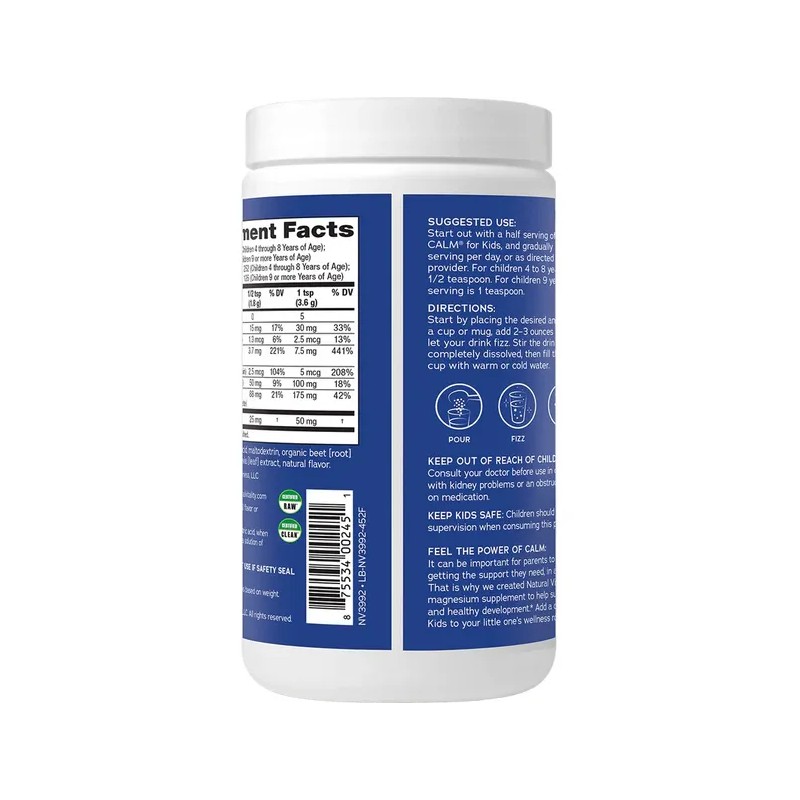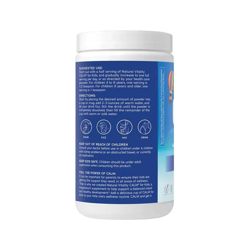 Natural Calm Kids Formula de Natural Vitality es un suplemento alimenticio en polvo formulado especialmente para niños, a base de magnesio iónico altamente absorbible, que ayuda a promover la relajación, el sueño tranquilo y el equilibrio emocional. 🌿💤