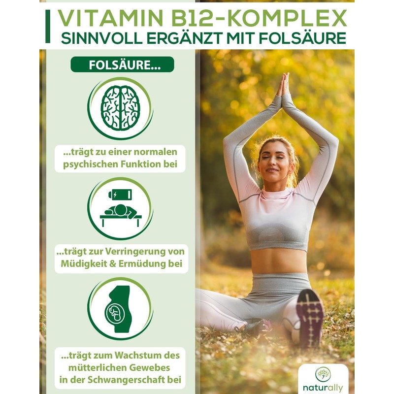 Natural Vitamin B12 Tablets with Folic Acid - 180 Tablets - Premium with Both B12 Active Forms & Folate 5-MTHF from Quatrefolic® - Laboratory Tested, No Additives, Vegan, Made in Germany
