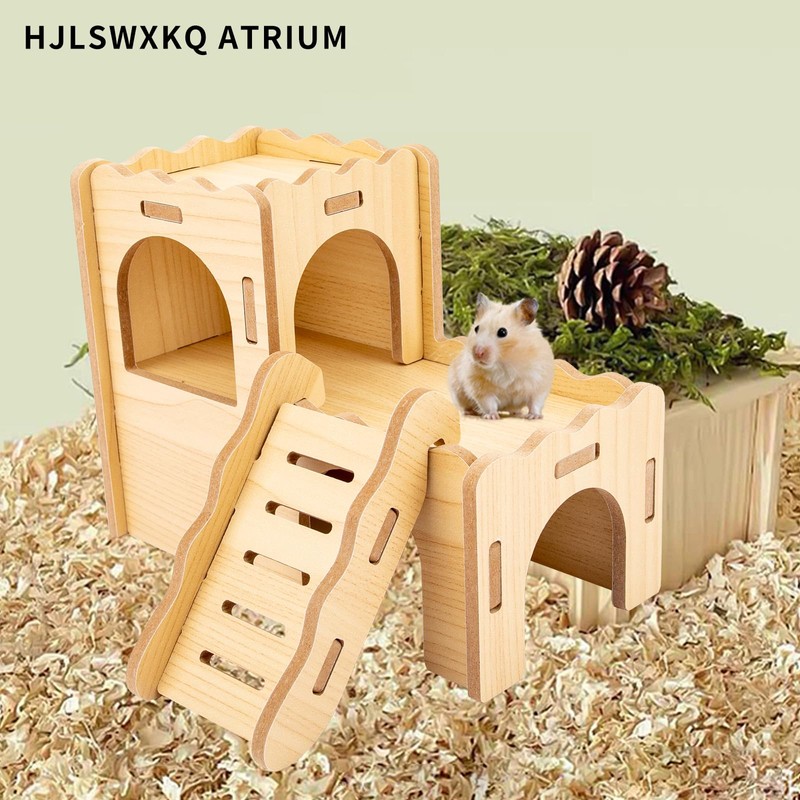 - FUN MAZE CABIN WITH SLIDE & LOOKOUT HOLES This double-decker cabin is more than a hideout; it's an adventure playground! Features a fun slide, connecting ramps, and multiple lookout holes. These holes allow your hamsters to satisfy their curiosity, keep an eye on their surroundings, and provide you with adorable opportunities to watch their fun activities.