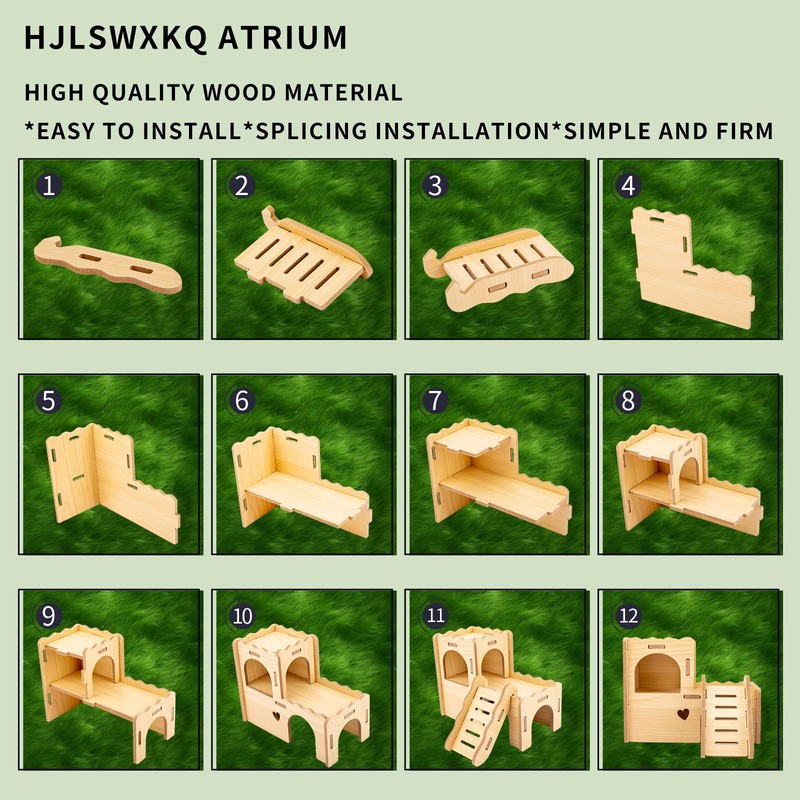 - Durable and easy to assemble. Made of durable wood, it's built to withstand everyday play and chewing. All parts are pre-cut for your convenience. Assembly is quick and easy, with no tools required—simply follow the illustrated instructions (see product images) and snap the parts together to create a safe and fun home for your pet.