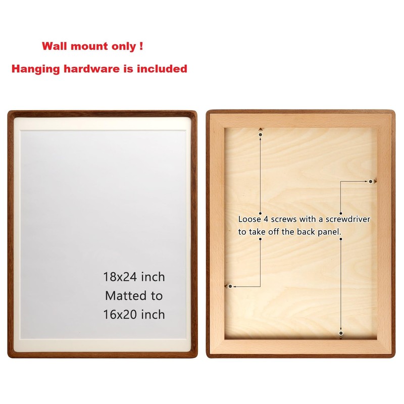 - Stand on the table or wall mount vertically or horizontally. (Frame size ove 14" comes with screw fixed back panel, designed for wall mount only, mounting hardware and a screw driver is included)