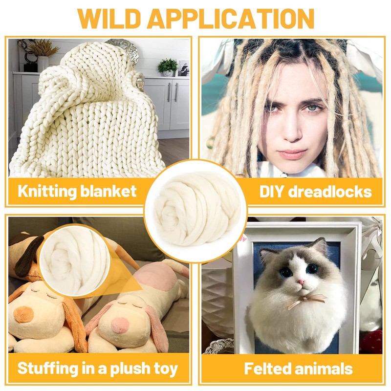 - Wide application: The needle felting wool is suitable for needle felting, wet felting, felted soap, jewelry making, dryer balls and blending custom colors, etc.; it can can be made into any handmade wool roving items, such as small stuffed animals, sports cars, wool paintings, wool plants, apparel, hats, slippers and so on, which meet the needs of different people; you can also use it after dyeing it, or use it as stuffing in a plush toy, to DIY dreadlocks, arm-knitting, etc.