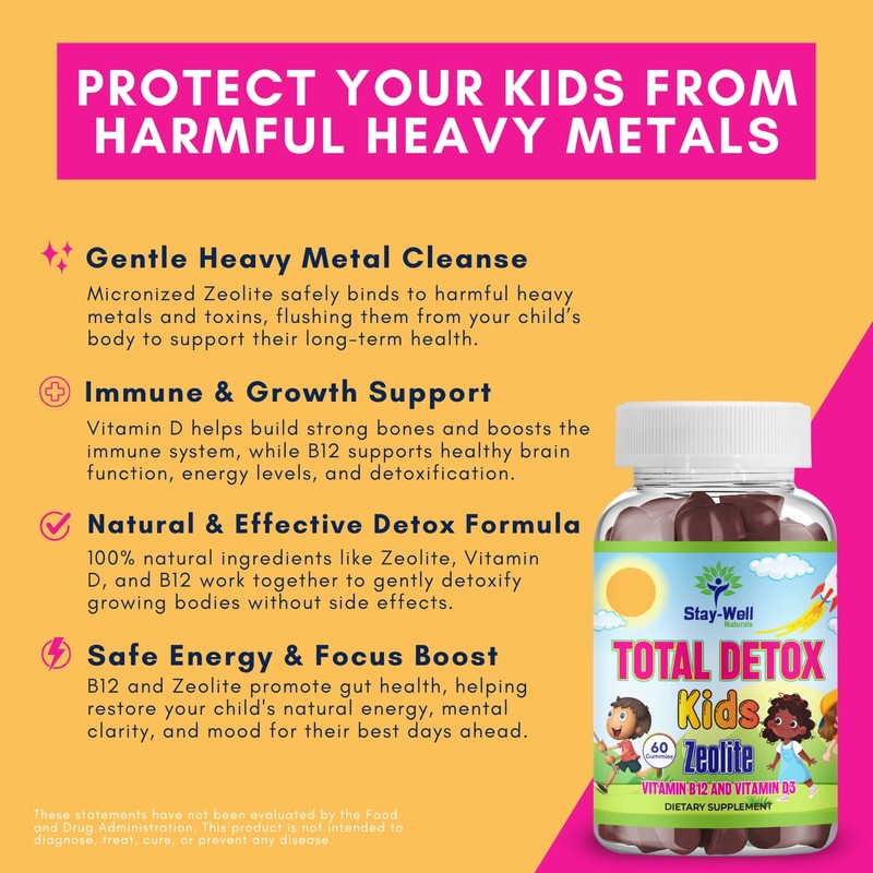 Our modern lifestyles have created a common issue called heavy metal toxicity, and our children are the most vulnerable to its potentially devastating effects. Industrial farming has introduced heavy metals into our soil and water which means they are present in our food supply. Heavy metals are also found in pharmaceuticals, building materials, household products, and even the air we breathe. Their toxic effects can take a toll on our digestive health, brain function, and nervous system leading to a host of health challenges. Helping your child safely detoxify from these harmful elements is one of the most significant steps you can take to give them a healthier, happier life. Zeolite is natural volcanic mineral powder that traps heavy metals and other toxins. Our Zeolite is micronized giving it an even greater surface area for maximum effectiveness. Zeolite Heavy Metal Detox Kids combines the natural substance, Zeolite, with Vitamin D and Vitamin B12 to give you a gentle way to detoxify your children’s bodies. Vitamin D is a common nutritional deficiency that can be easily remedied when your child chews 2 gummies per day in addition to eating a healthy diet. Vitamin B12 has been added to support detoxification and healthy cognitive function.* Difficulty concentrating, poor memory, headaches, poor gut health and low mood may all be signs your child could benefit from heavy metal detoxification support.* Our Zeolite is an excellent choice because it works at the cellular level to pull toxins out of our entire system, cleansing the liver and colon while helping to restore mental clarity and energy. Zeolite Heavy Metal Detox Kids offers an easy way to help your children thrive in today’s world by simply chewing 2 delicious gummies every day!