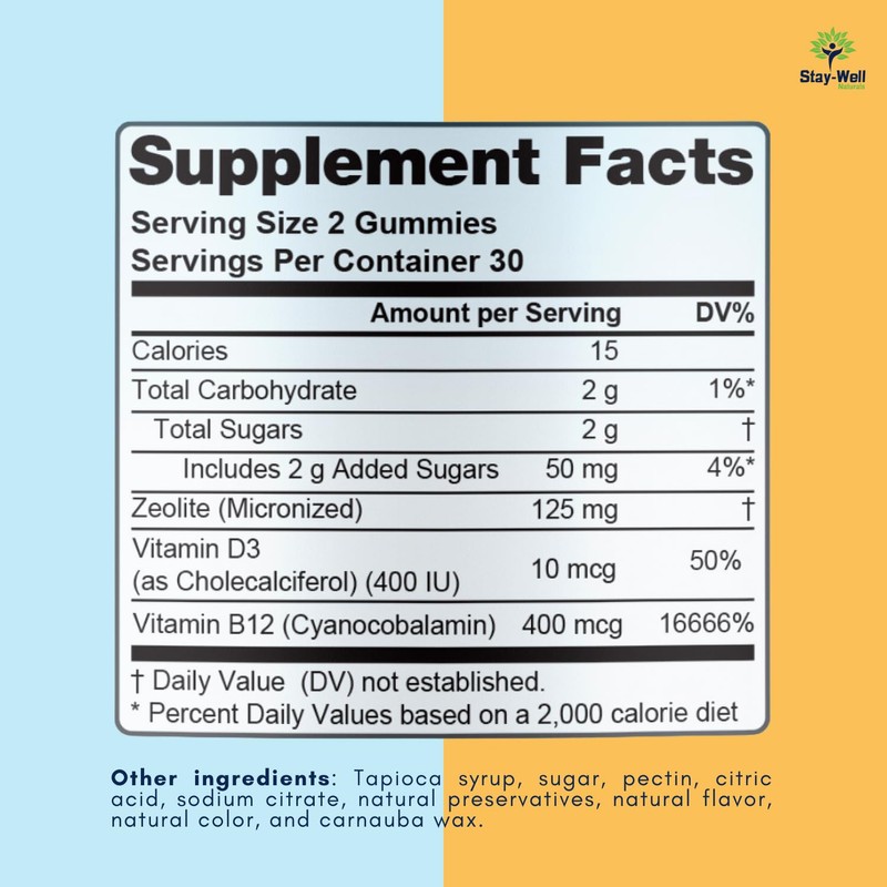 - 100% Natural – Our formula is completely natural with no side effects. We have combined the power of pure zeolite with two important vitamins in a gummy that is naturally flavored and colored for safe supplementation.