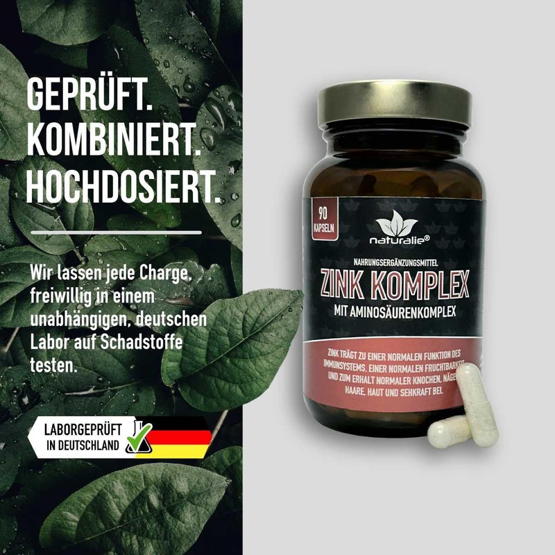 naturalie® - Zinc in 3-fold complex with L-histidine and 10 other amino acids | 90 capsules | 25 mg high dose, bioavailable | laboratory tested without unnecessary additives | BPA-free brown glass