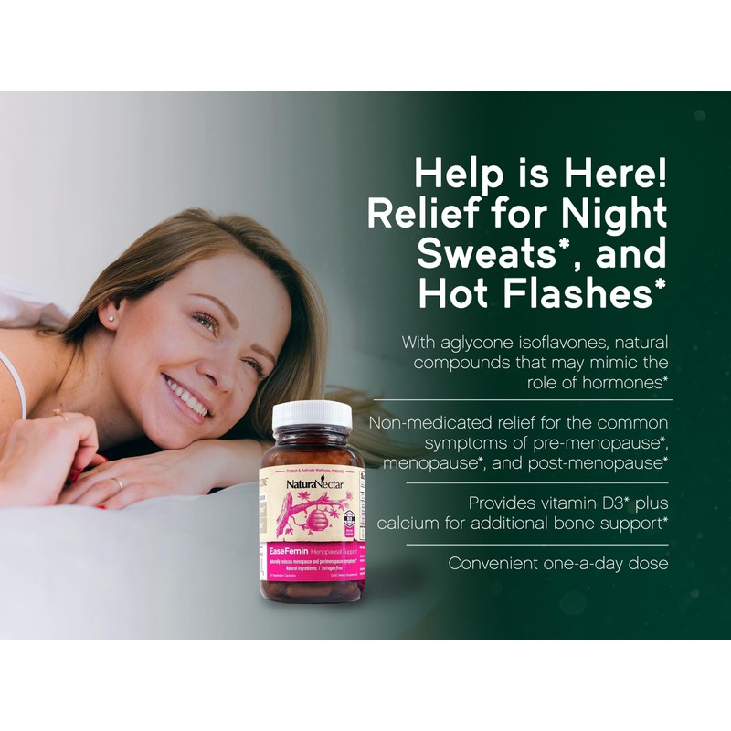 - SAY GOOD BYE TO NIGHT SWEATS & HOT FLASHES*: Improve your quality of life with EaseFemins’ isoflavones and herbal blend specially formulated to help with relief from night sweats, hot flashes, and irritability. It may also provide a sense of calm for a better night of sleep.*