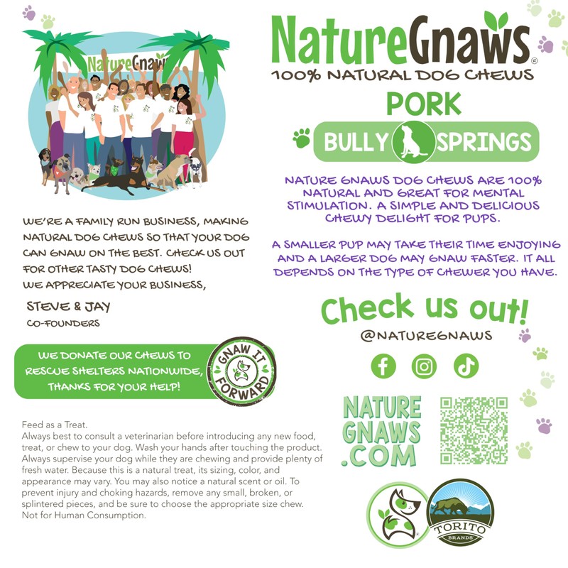 Nature Gnaws Pork Bully Stick Springs for Dogs 7-8" (12 Count) - Long Lasting for Small and Medium Dogs - Natural Bacon Dog Chew Treats - Rawhide Free