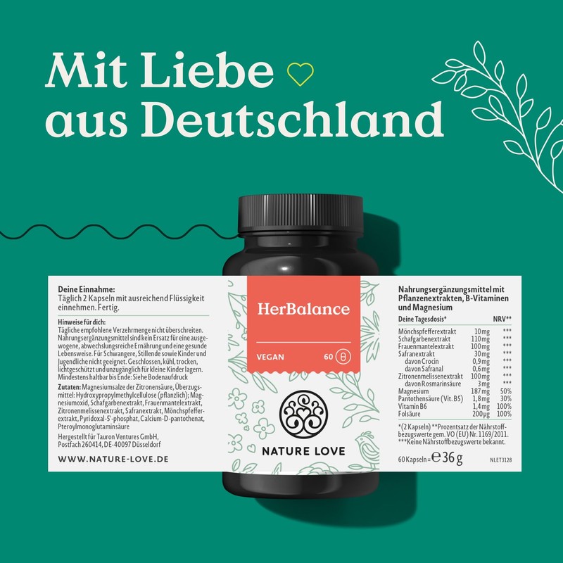 NATURE LOVE® HerBalance 60 Capsules with Monk Pepper, Magnesium, Vitamin B6, Folic Acid, Vegan, High Dosage, Laboratory Tested