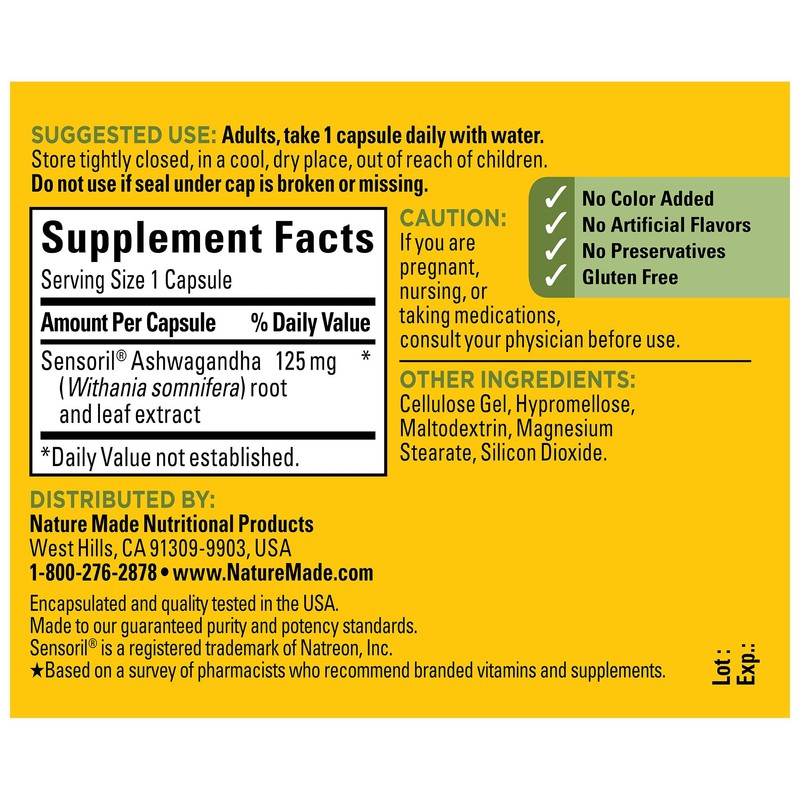 Nature Made Ashwagandha Capsules are dietary supplements using clinically studied Sensoril Ashwagandha to reduce stress and occasional anxiousness (1). In a clinical study, participants reported decreased stress in 4 to 8 weeks. Sourced from high-quality ingredients, this gluten free Ashwagandha for men and women dietary supplement contains no color added, no artificial flavors and no preservatives. Long revered in Ayurvedic medicine, ashwagandha helps reduce stress. These Nature Made stress supplements contain Sensoril Ashwagandha, which reduces perceived stress and cortisol to help restore balance to the adrenals. This supplement uses an Ashwagandha root and leaf extract. Adaptogens such as Ashwagandha may help the body adapt to and reduce stress. These Ashwagandha supplements are perfect for any adult looking to help reduce stress in their lives. Adults, take one Ashwagandha capsule daily with water. (1) Sensoril is clinically studied to reduce cortisol and perceived stress. *Based on a survey of pharmacists who recommend branded vitamins and supplements.