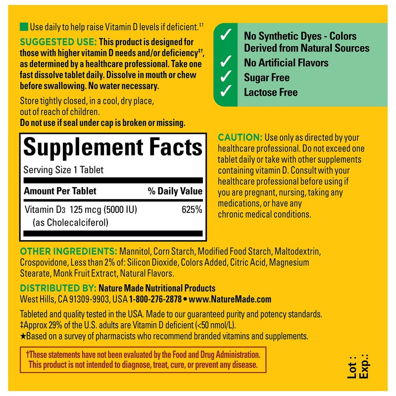 Nature Made Extra Strength Vitamin D3 5000 IU (125 mcg) Fast Dissolve Tablets are an easy and enjoyable way to add a Vitamin D supplement to your daily routine. Vitamin D3 supports bone, teeth, muscle and immune health. These sugar free and lactose free D3 Vitamin tablets have no artificial flavors and no synthetic dyes - colors derived from natural sources. Each D3 Vitamin 5000 IU tablet supports a healthy immune response and aids in Calcium absorption. Vitamin D is a common nutrient shortfall. Vitamin D 3 is the body's preferred form of Vitamin D to help maintain Vit D levels. Designed for those with higher Vitamin D needs and/or deficiency as determined by a healthcare professional(1). Featuring a delicious mixed berry flavor with other natural flavors, adults dissolve 1 tablet in mouth before swallowing, no water necessary. Do not exceed 1 tablet daily. Start your day with Nature Made Vitamin D3 supplements. Nature Made is the #1 Pharmacist Trusted vitamin and supplement brand.* (1)Approximately 29% of U.S. adults are Vitamin D deficient (<50 nmol/L). *Based on a 2022 survey of pharmacists who recommend branded vitamins and supplements.