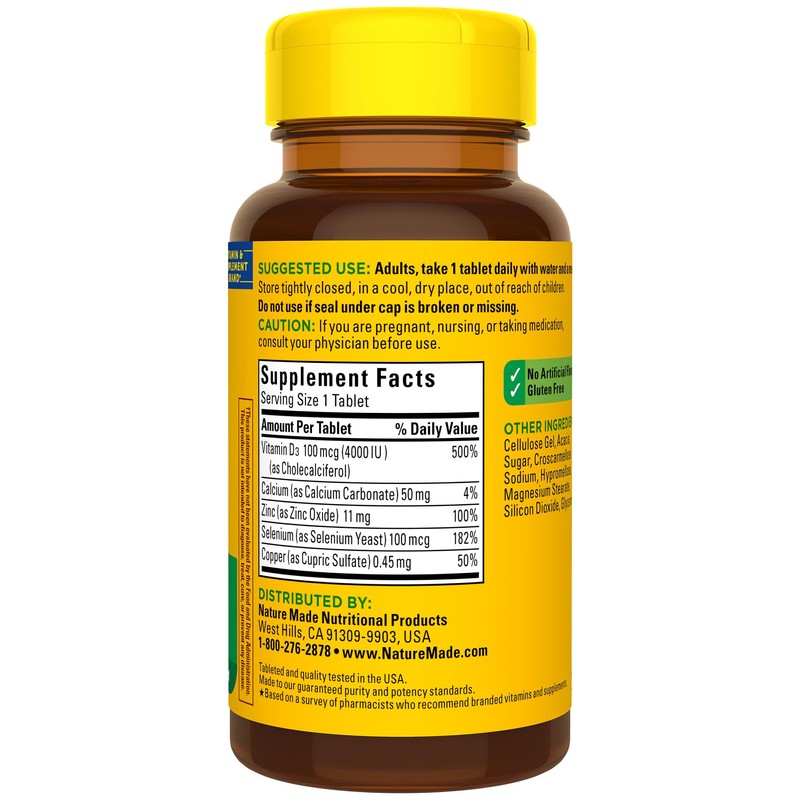 Nature Made Super D Immune Complex is an immune support supplement that is an excellent source of Vitamin D, Selenium, Zinc, and Copper. Vitamin D3 is an essential nutrient that helps support a healthy immune response, supports muscle, teeth and bone health, and helps improve Calcium absorption. Zinc, Selenium, and Copper are essential minerals that provide antioxidant support and also support immune health. Each tablet provides Vitamin D3 4000 IU (100 mcg), Selenium 10 mcg, Zinc 11 mg, and Copper 0.45 mg. Sourced from high-quality ingredients, these Vitamin D, Copper, Selenium and Zinc supplements have no artificial flavors and are gluten free. Start your day with Nature Made Vitamin D supplements. (1) Based on a survey of pharmacists who recommend branded vitamins and supplements.