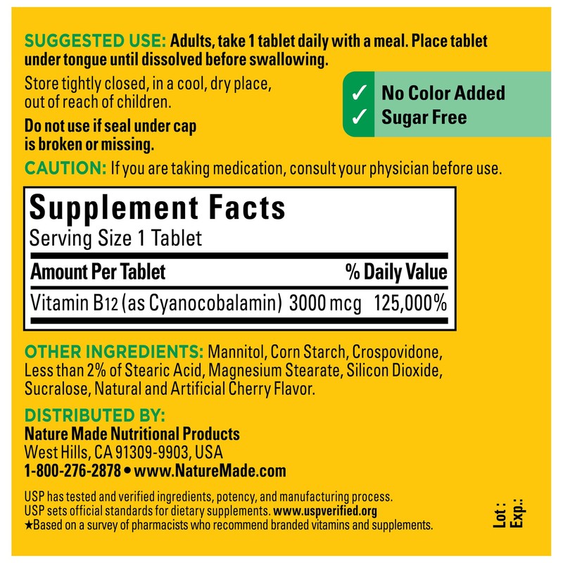 Product DescriptionNature Made Sublingual Vitamin B12 3000 mcg fast dissolve tablets help break down food into energy that your body can use all day long. Sourced from high-quality global ingredients, this B12 vitamin is a dietary supplement that is sugar free and has no color added. This Vitamin B12 dietary supplement supports energy metabolism(1). Adults take one Nature Made Vitamin B12 sublingual 3000 mcg fast dissolve tablet daily with a meal. Place this Vitamin B12 supplement under the tongue until dissolved before swallowing. Start your day with Nature Made supplements. USP has tested and verified ingredients, potency and manufacturing process. USP sets official standards for dietary supplements. Visit the USP verified website for more information. (1)Helps convert food into cellular energy. (2)Adequate Vitamin B12 status helps support a healthy mood. *Based on a 2022 survey of pharmacists who recommend branded vitamins and supplements. These statements have not been evaluated by the Food and Drug Administration. This product is not intended to diagnose, treat, cure, or prevent any disease.Brand StoryBy Nature Made