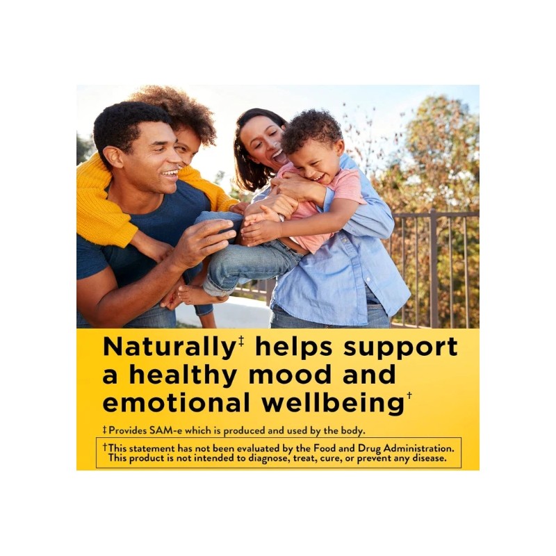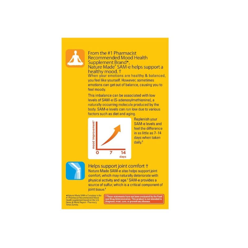 SAM-e is a molecule made in the cells of our bodies. However, SAM-e levels can run low due to various factors such as diet and aging. Nature Made® SAM-e Complete®◆ supports a healthy mood in as little as 7–14 days when taken daily. SAM-e also provides a source of sulfur, a critical component of joint tissue. Adults, take 1 tablet daily with water on an empty stomach.