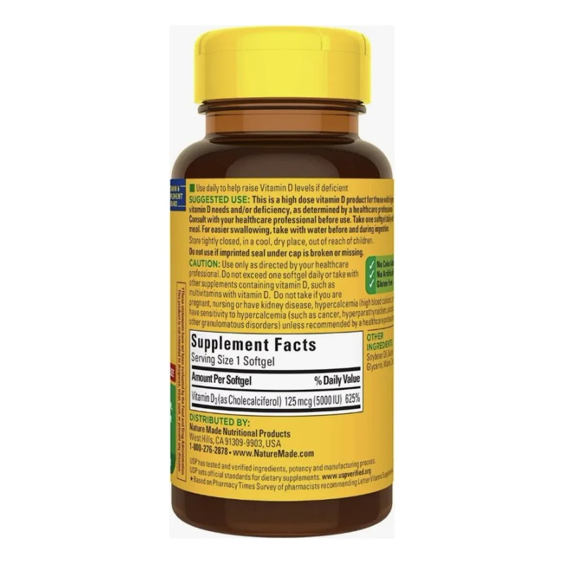 - ¿PARA QUÉ SIRVE? Suplemento de apoyo para la salud inmunológica, muscular, dental y hueso: contiene una botella de 180 unidades de Nature Made Extra Strength Vitamin D3 5000 UI (125 mcg) cápsulas blandas para un suministro de 180 días. Nature Made Las cápsulas blandas de vitamina D de 5000 UI ayudan a mejorar la absorción de calcio, apoyan la salud ósea, la salud de los dientes, la salud muscular y proporcionan apoyo inmunológico INGREDIENTES Vitamina D3 125 mcg BENEFICIOS Este producto de alta dosis de vitamina D3 es para aquellos con mayores necesidades y/o deficiencia de vitamina D, según lo determine un profesional de la salud. INSTRUCCIONES DE USO Adultos, tomar una cápsula blanda de vitamina D3 Nature Made diariamente con agua y una comida. Procedente de ingredientes de alta calidad, este suplemento Nature Made Vit D3 no contiene gluten y no tiene color añadido ni sabores artificiales. Este suplemento han sido elaborado en un laboratorio aprobado por la FDA Este producto no es un medicamento. El consumo de este producto es responsabilidad de quien lo recomienda y de quien lo usa. Aviso legal