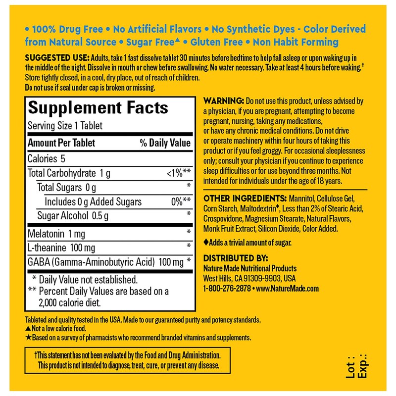 - HIGH QUALITY INGREDIENTS: This sugar free (3) occasional use sleep aid is 100% drug-free and non-habit forming; Adults, take 1 fast dissolve tablet 30 minutes before bedtime or upon waking in the middle of the night, no water needed