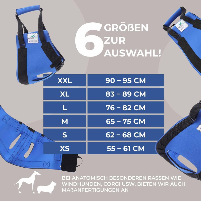 - Outer dimensions of your dog's wearer – measure the chest circumference of your dog while standing directly behind the front rails – available in 6 sizes
