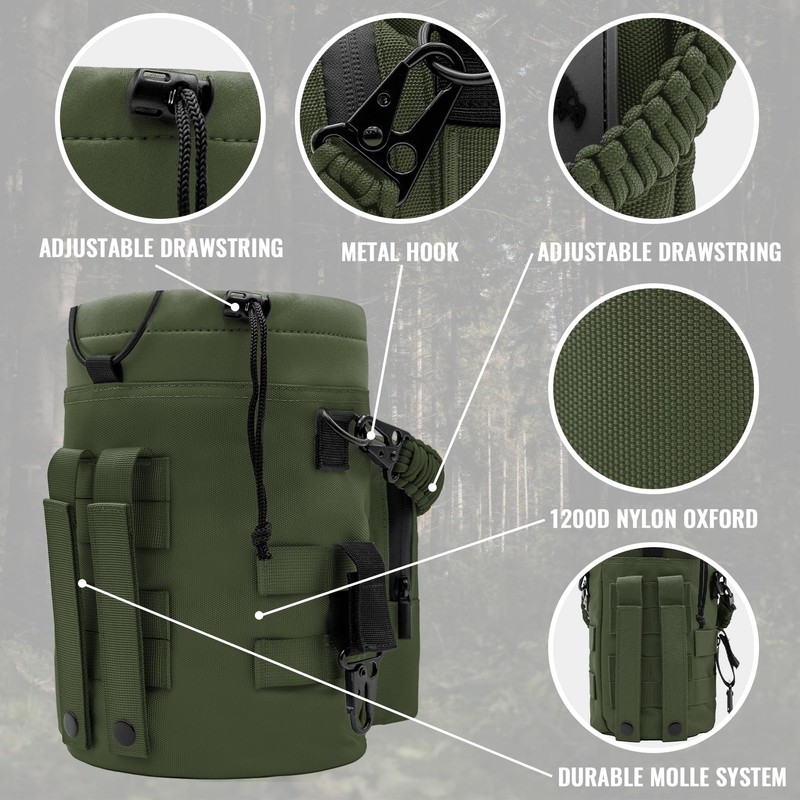 - 【INSULATED AND DURABLE PROTECTION】- tactical water bottle bag is made from double layered quality 1200D polyester and insulated neoprene, designed for protecting against accidental scratching and denting, but also increased insulation for keeping cold or hot. Made from high quality double-wall stainless steel and military grade fabrics, making this a necessary piece of your go-to gear and gear for hiking, camping, hunting, work, or the gym
