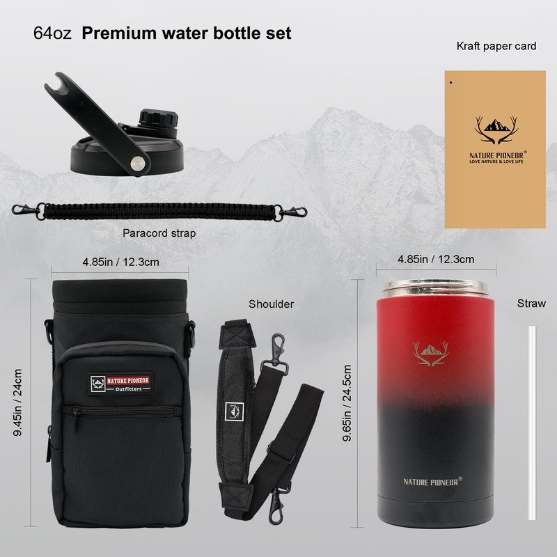 - 【SUPER DEAL COMBO】- You’ll get 1 x 64OZ insulated water bottle, 1 x water bottle holder, 1 x Box. Different lids add possibilities to use anywhere at gym, concerts, picnics, camps. NATURE PIONEOR water bottle with delicate box works as a perfect combination.