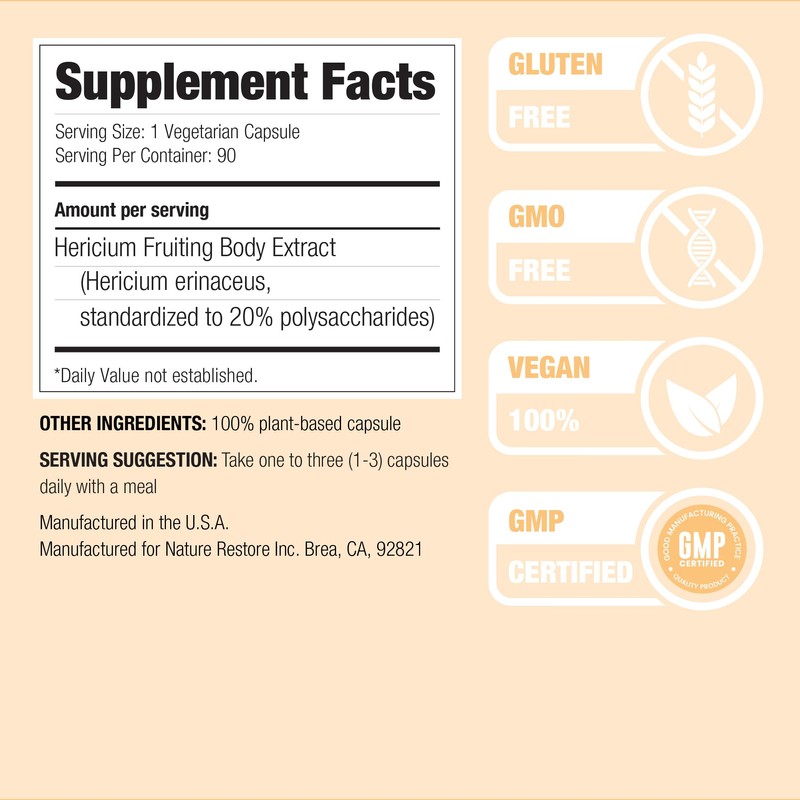 Nature Restore Hericium Erinaceus Extract Mushroom Supplement, 90 Capsules, 20% polysaccharides