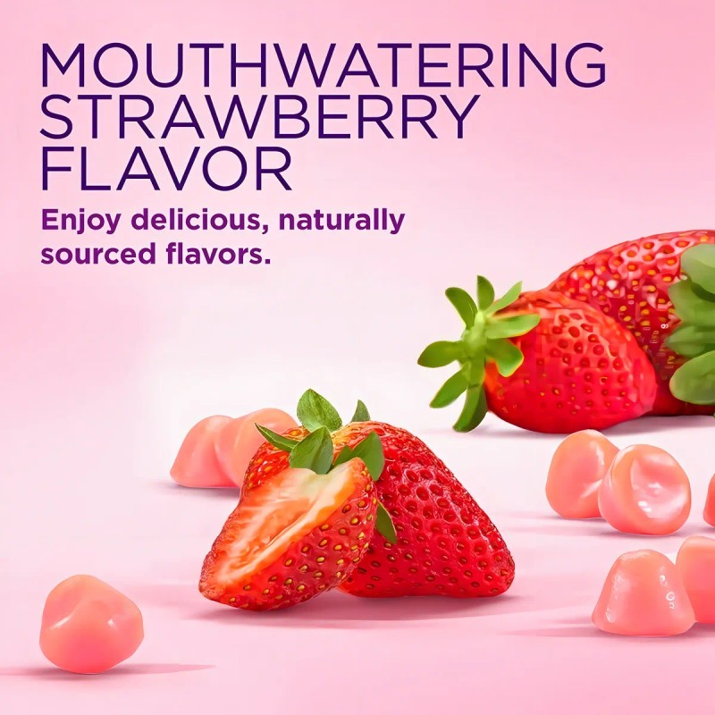 Azúcar, jarabe de maíz, fosfato dicálcico, gelatina. Contiene <2 % de: ácido cítrico, ácido láctico, maltodextrina, sabor natural a fresa, pectina, sílice, zumo vegetal (colorante), aceite vegetal (palma) (contiene cera de carnaúba).