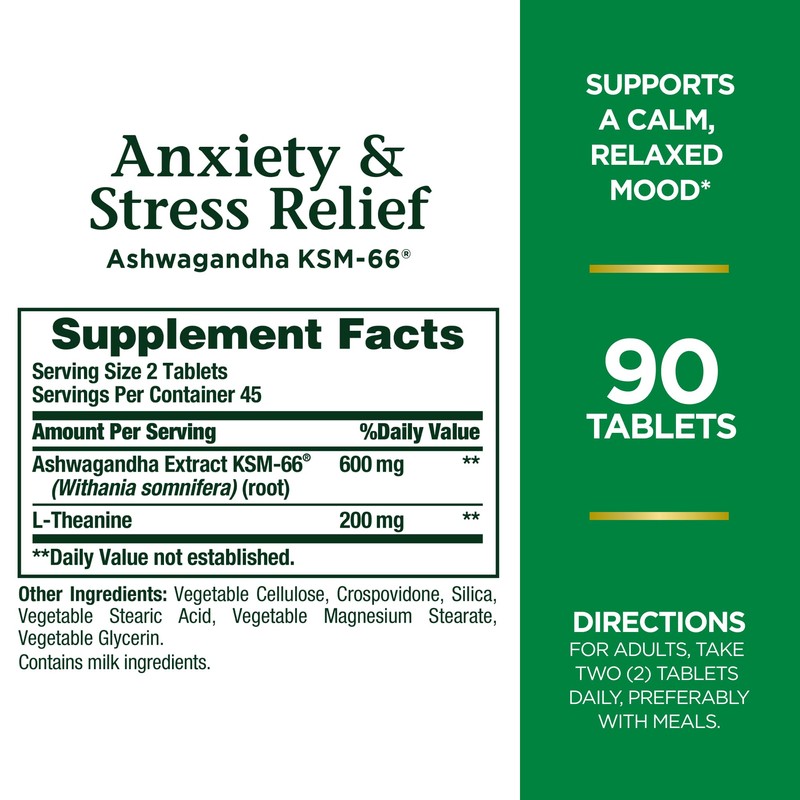 Nature's Bounty Stress Relief tablets offer support for maintaining a calm state of mind, even during times of occasional stress.(1) Formulated with clinically studied Ashwagandha KSM-66, a popular adaptogenic herb, this herbal supplement helps your body respond to stress.(1) Each serving provides 200 mg of L-Theanine, an amino acid known for its ability to promote relaxation and support a balanced mood.(1) By combining these key ingredients, Nature's Bounty Stress Relief tablets provide comprehensive support for managing stress and promoting emotional well-being.(1) Incorporate this supplement into your daily routine to experience a sense of calm and resilience in the face of life's challenges.(1) With Nature's Bounty Stress Relief tablets, you can take proactive steps toward a balanced and harmonious state of mind.(1) Like all Nature's Bounty products, our stress relief supplements are backed by 50 years of quality, science, and great ingredients?uaranteed. Each bottle contains 90 tablets.