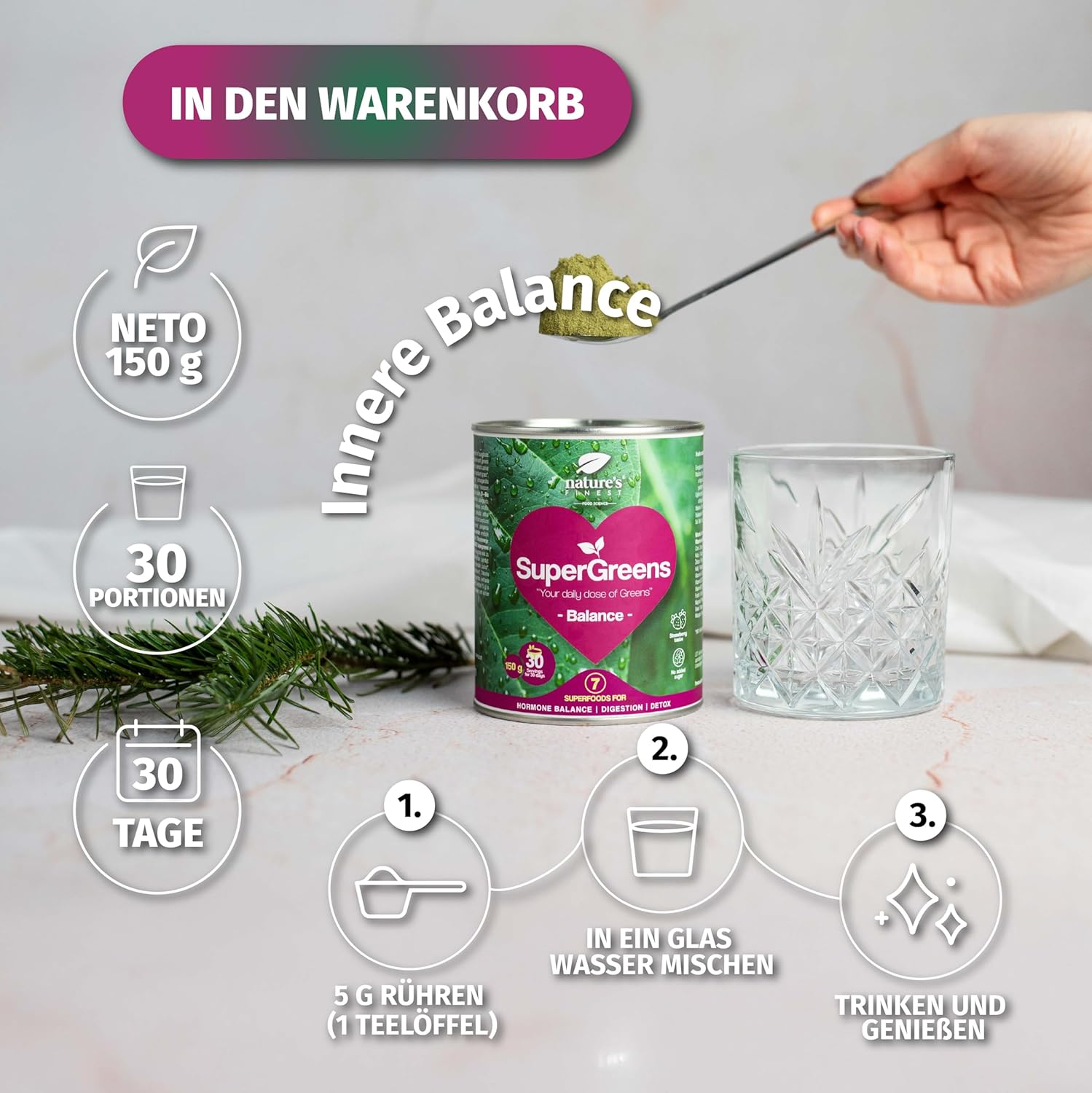 - Leicht in den Alltag integrierbar – Ob als tägliche Ergänzung zu deiner Ernährung, als Energie-Booster nach dem Sport oder zur Unterstützung eines ausgeglichenen Lebensstils – Supergreens Balance lässt sich vielseitig einsetzen. Einfach einen Löffel in Wasser, Saft oder deinen Lieblings-Smoothie geben und die volle Power der Natur genießen!