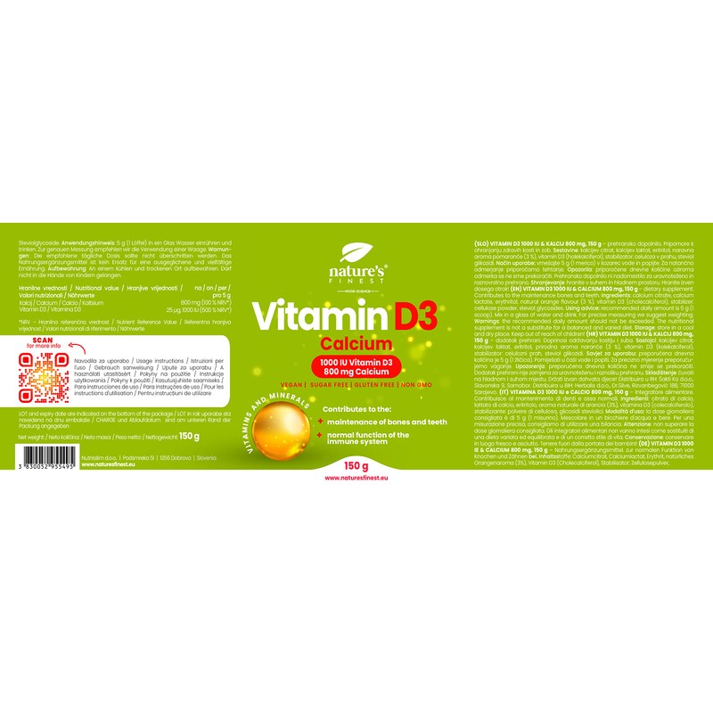 Nature's Finest Vitamin D3 + Calcium 1000 IU (500% NRV) Vitamin D3 per Dose 800 mg (100% NRV *) Calcium per Dose For a Strong Immune System, Bones and Teeth
