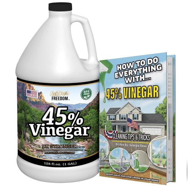 Nature's Freedom 45% Concentrated Vinegar, 1 Gallon with “How to Use Vinegar” Cleaning Book – Industrial Strength Multi-Purpose Cleaner