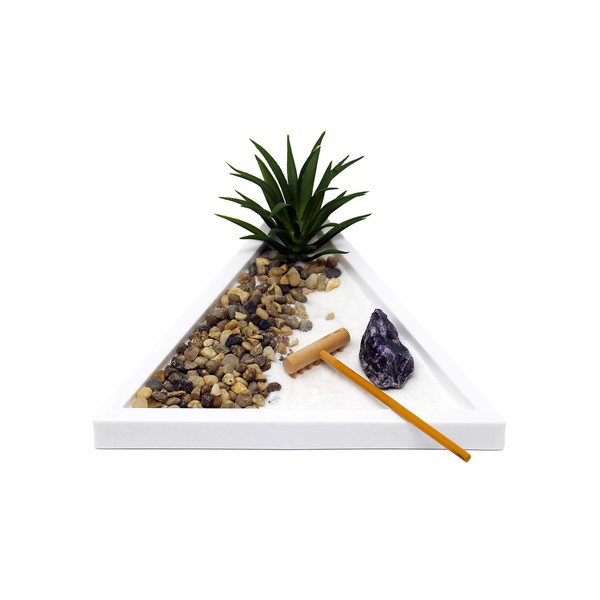 Nature's Mark Mini Zen Garden Kit for Desk with Rake, White Sand, White Triangle Base, Crystal Rock, Mini River Rocks and Air Plant, (7Lx6W Triangle W)
