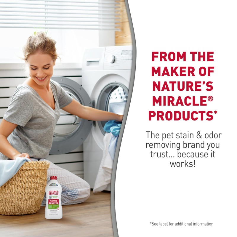 Nature's Miracle? pet stain and odor removers have been a trusted brand for pet mess cleanup for more than 40 years. Nature's Miracle? stain and odor removers, virus disinfectants, training aids, litter and waste management and grooming products offer solutions for life with pets, from everyday messes to the toughest cleanup jobs. Nature's Miracle? Laundry Boost In-Wash Stain and Odor Remover is formulated with bio-enzymatic technology which helps break down and destroy tough pet stains and odors, such as urine, feces, vomit, blood, grass and drool. This laundry stain and odor removing additive works in all machines including HE and is powerful on stains but gentle on fabrics, so it's perfect for use on clothing, pet beds and more*. Formulated without phosphates, parabens, sulfates and bleach, it's safe for pets and home, when used as directed. Plus, OdorCapture 360? technology provides an odor neutralizing system. Use in addition to your laundry detergent to help loosen and remove tough pet stains and odors. *Not for use on specialty fabrics, including washable silk, khaki, fluorescents, wool, suede and leathers.