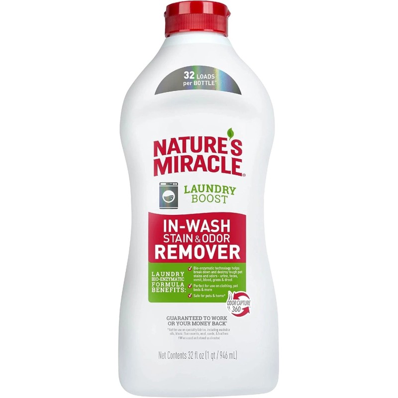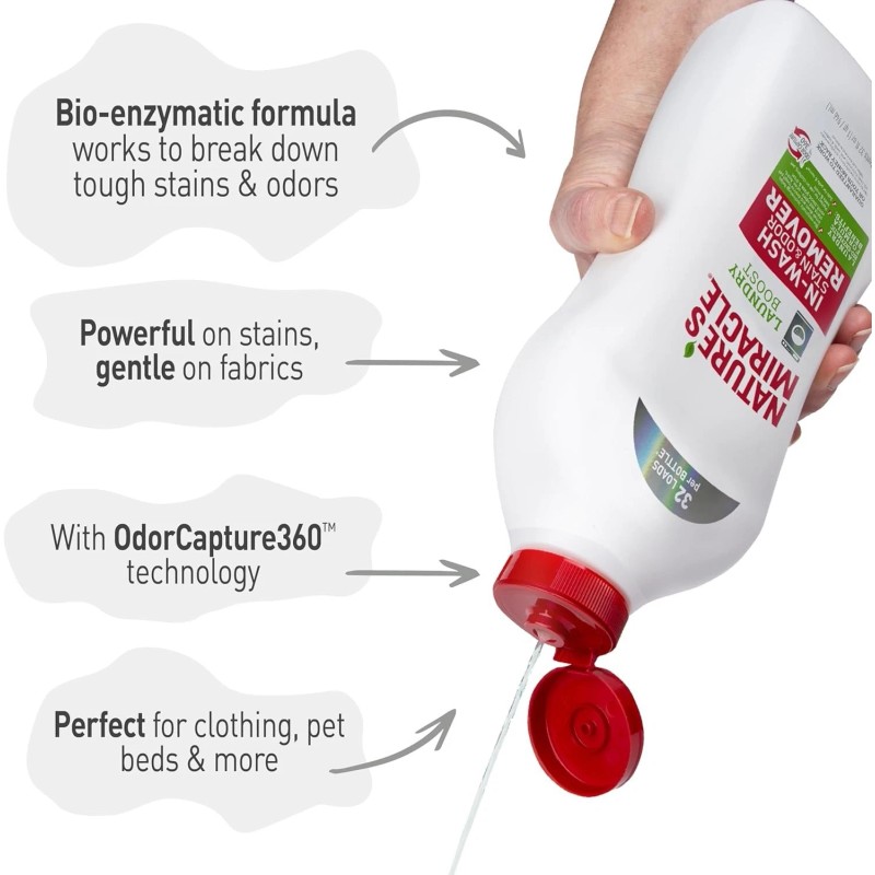 Nature’s Miracle® pet stain and odor removers have been a trusted brand for pet mess cleanup for more than 40 years. Nature’s Miracle® stain and odor removers, virus disinfectants, training aids, litter and waste management and grooming products offer solutions for life with pets, from everyday messes to the toughest cleanup jobs. Nature’s Miracle® Laundry Boost In-Wash Stain and Odor Remover is formulated with bio-enzymatic technology which helps break down and destroy tough pet stains and odors, such as urine, feces, vomit, blood, grass and drool. This laundry stain and odor removing additive works in all machines including HE and is powerful on stains but gentle on fabrics, so it’s perfect for use on clothing, pet beds and more*. Formulated without phosphates, parabens, sulfates and bleach, it’s safe for pets and home, when used as directed. Plus, OdorCapture 360™ technology provides an odor neutralizing system. Use in addition to your laundry detergent to help loosen and remove tough pet stains and odors. *Not for use on specialty fabrics, including washable silk, khaki, fluorescents, wool, suede and leathers.