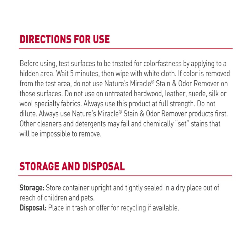 Natures Miracle? pet stain and odor removers have been a trusted brand for pet mess cleanup for more than 35 years. Whatever pets do, you can trust Natures Miracle stain and odor removers, training aids, disinfectants and litter products to undo. Accidents happen, as every cat owner knows. Natures Miracle Stain & Odor Remover for cats is an enzymatic spot stain and odor remover thats tough on cat urine, feces, vomit, drool and other organic stains while freshening with a light citrus scent! Bacteria-based formulas produce enzymes when they come into contact with a food source C pet urine, feces, vomit and other bio-based messes. This enzymatic cleaner continues working as long as the food source is present. Use on carpets, hard floors, furniture, fabrics and more (see the product label for a complete list of fabrics). Do not use on untreated hardwood, leather, suede, silk or wool specialty fabrics. Always use this product at full strength. Just spray, wait 15 minutes, then blot up stain with a white cloth. When used as directed, this product is safe to use around your pets and in your home. Always use Natures Miracle products first. Other cleaners and detergents may fail and chemically set stains that will be impossible to remove.