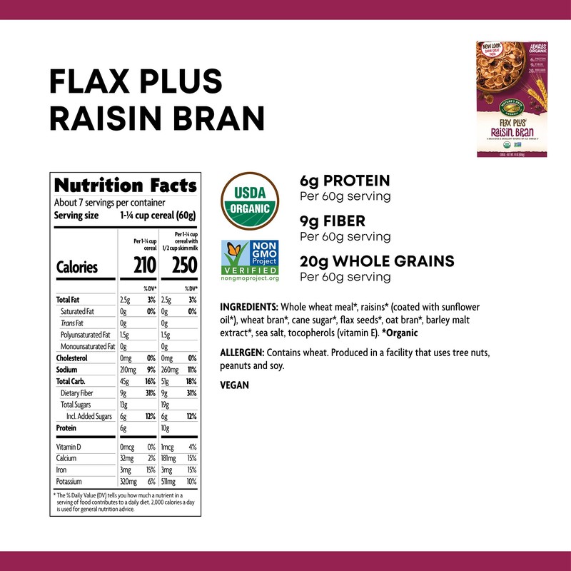 - Experience a hearty crunch in every bite when making Flax Plus Raisin Bran your go-to cereal in the morning. This organic cereal includes a rich blend of fiber-filled whole grains, ALA Omega-3 rich flax seeds and sweet, dried raisins