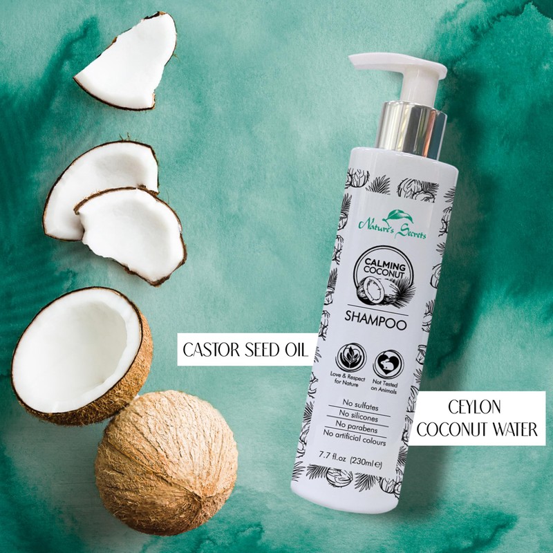 Nature's Secrets Calming Coconut Shampoo. With Castor Oil. Sulfate-Free. Silicone-Free. Paraben-Free. Gentle Cleansing for Soft Hair.