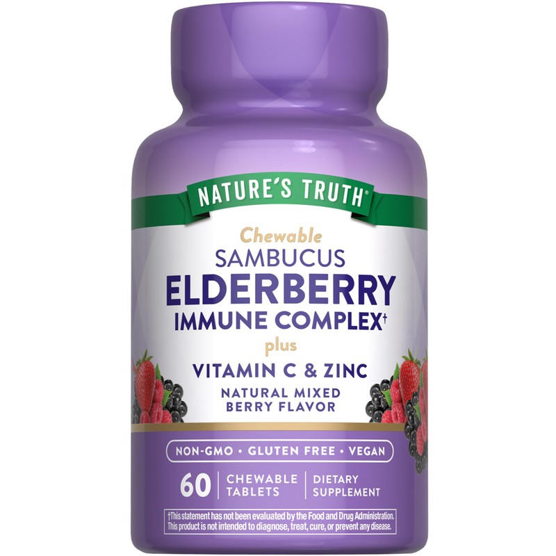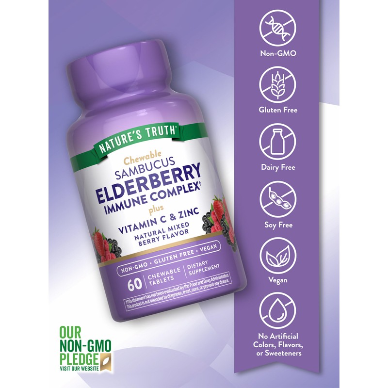 Powered by Black Elderberry:Black Elderberry is a traditional berry that has been used by Native Americans and Ancient Egypt for centuries. Our Elderberry is exclusively harvested from the mountains of Austria, where the soil is brimming with essential minerals and provides the best landscape for these nutrient-dense fruits to blossom and grow. Naturally rich in antioxidants and flavonoids, Elderberry is a valuable addition to health routines everywhere.Nature's Truth Elderberry Immune Complex:Get the goodness of Elderberry along with the tried-and-true vitamin and mineral support of Vitamin C and Zinc, for a trio you won't want to do without. Nature's Truth Black Elderberry Immune Complex Chewables have a natural and delicious mixed berry flavor and are super convenient to take. Just one chewable tablet a day provides the equivalent of 1,000 mg of Sambucus Black Elderberry, 250 mg of Vitamin C, and 20 mg of Zinc to help support your health and wellness all year long. Each bottle contains a two-month supply, making it an excellent value for anyone looking for extra immune support.*Commitment to Clean Wellness:At Nature's Truth, we know how important a clean wellness experience is for you and the ones you love. That's why we only use the very best ingredients in the creation of our Black Elderberry Immune Complex Chewables. Our vegan-friendly chewable tablets are Non-GMO, gluten free, dairy free and soy free, and are created without any artificial colors, artificial flavors, artificial sweeteners or preservatives so you can get the pure and honest nutrition you've come to expect from Nature's Truth.