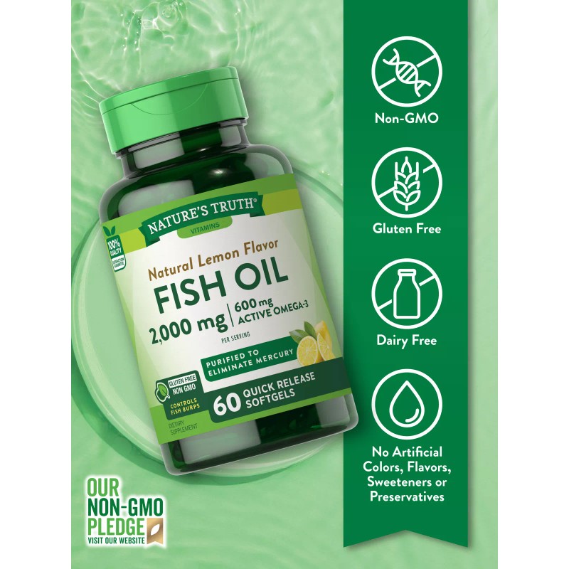 What Is Fish Oil? Fish oil is a source of omega-3 fatty acids, which the body uses for various functions as they contain a variety of naturally occurring nutrients. Two important omega-3 fatty acids are Docosahexaenoic Acid (DHA) and Eicosapentaenoic Acid (EPA). These fatty acids can be derived from food sources such as salmon, shellfish, and trout; but for those who don’t eat these fish every day, a trusted supplement can be a reliable source. Nature’s Truth Fish Oil Softgels Each serving of our Fish Oil softgels delivers 2,000 mg of Purified Fish Oil, which includes 600 mg of Omega-3 fatty acids. These softgels are a natural lemon flavor to combat the unpleasant aftertaste that is often associated with fish oil, known as fish burps. Our formula is also purified to eliminate mercury so you can feel confident taking these each day. Nature’s Truth: Where Wellness Begins Our mission at Nature’s Truth is to meet your wellness needs with products that go above and beyond. Nature’s Truth provides supplements in various delivery forms, such as capsules, softgels, chewables, tablets, powders, liquids, and gummies to suit every preference. Our Fish Oil is non-GMO and free of gluten, wheat, yeast, milk, lactose, artificial color, artificial flavor, artificial sweetener, and preservatives.