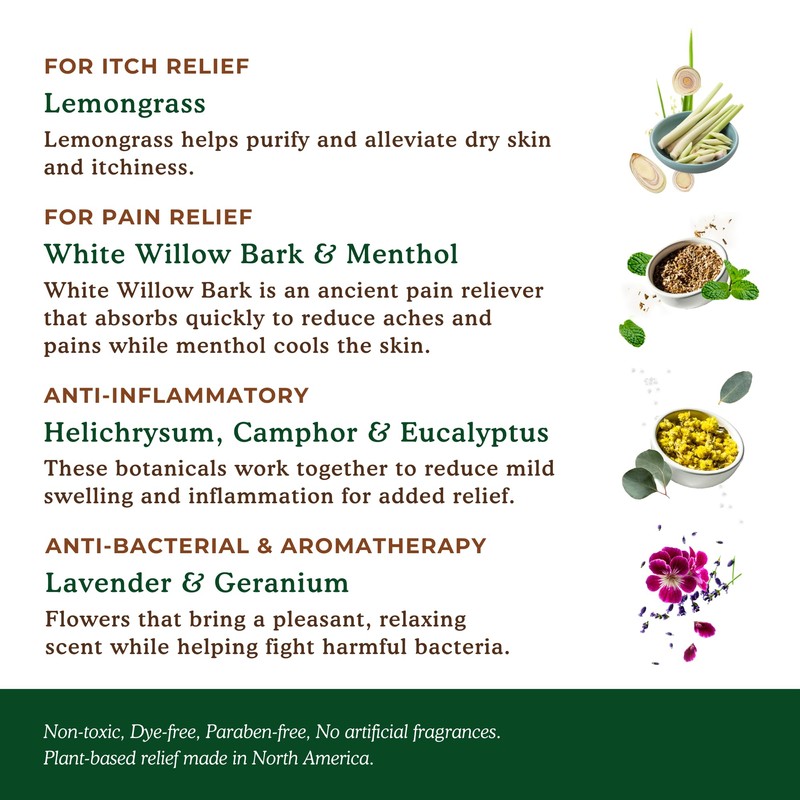 - All Natural Ingredients: Nature's Willow Itch Relief Lotion is non-toxic, free of all dyes, paraben-free, and contains no artificial fragrances. Our anti itch cream provides relief using a patented formula which combines White Willow Bark, Helichrysum, lavender, menthol, camphor and eucalyptus for their counter-irritant properties.