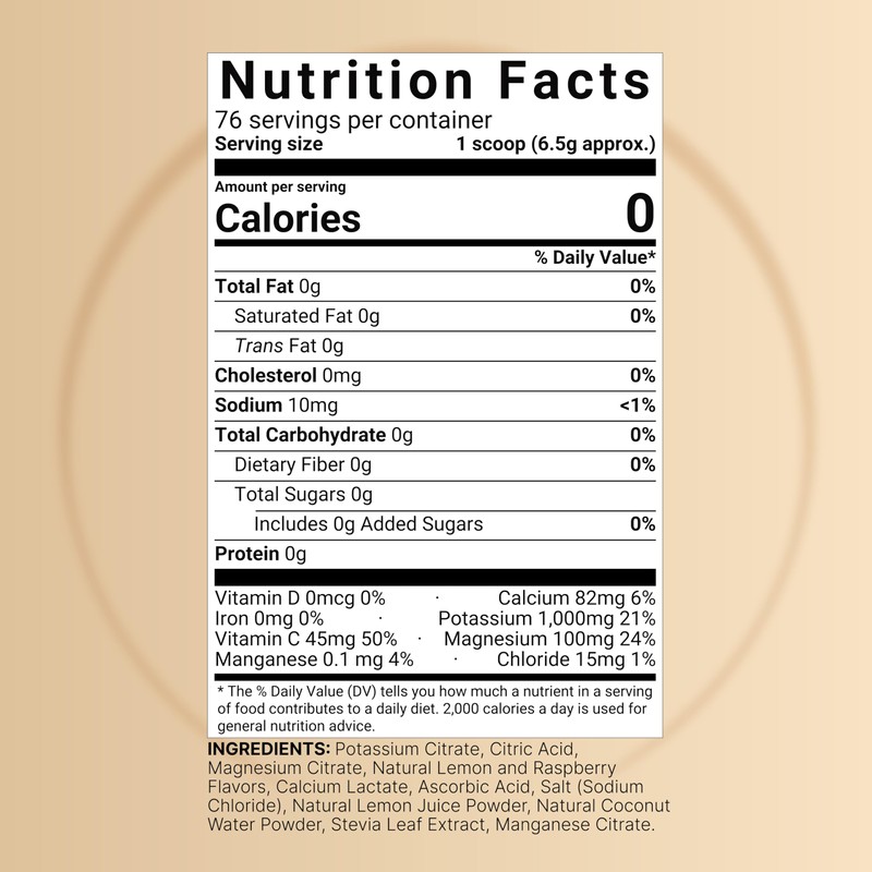 - Refreshing lemon and raspberry flavored electrolyte powder, sourced naturally from coconut water and essential minerals, 500g supply (1.1 pound), 76 servings