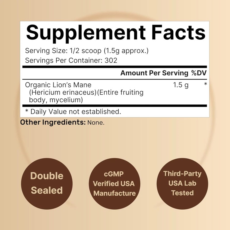- Organic Lion’s Mane mushroom Powder, extra strength 1,500mg per serving, fresh high-concentrated fruiting body and mycelium source.