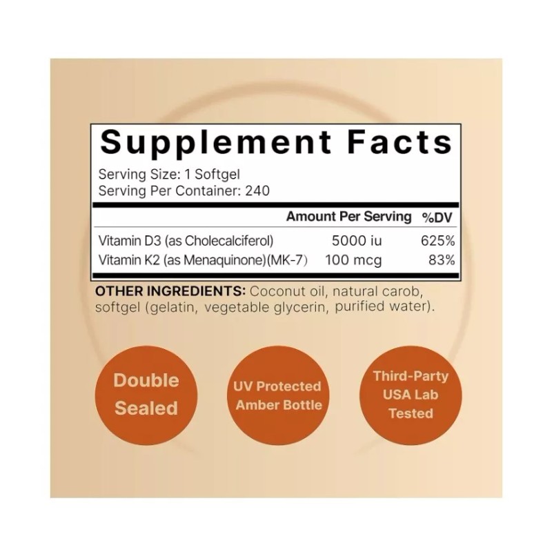 - Strongest multi-benefit vitamin supplements offering only 1 softgel per serving. 5000 iu vitamin D3 with 100 mcg of vitamin K2. Each bottle has 240 potent softgels totaling an 8 month supply of safe and effective ingredients.