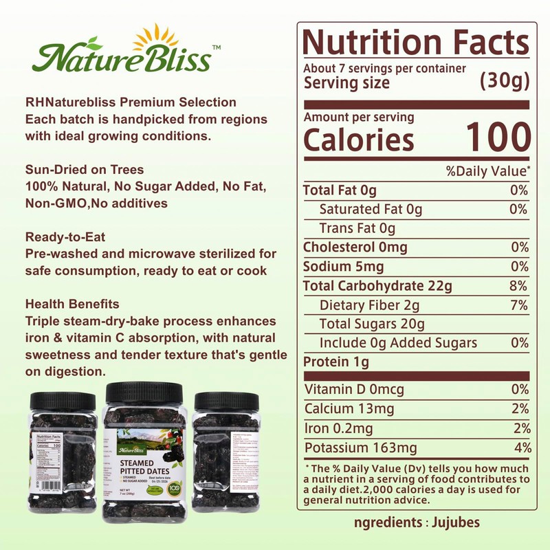 - ✅ Triple Steamed & Baked: Our NatureBliss pitted jujubes undergo a 72-hour traditional steaming and baking process with microwave sterilization, enhancing sweetness while locking in the natural jujube aroma.