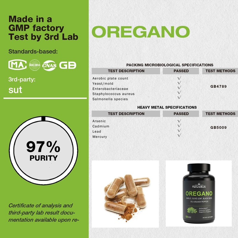 • Immune Support & Digestive Wellness in Every Capsule – NatureBulk's powerhouse formula combines Oregano Leaf Extract, Garlic Extract (1% allicin), Olive Leaf, Black Seed Oil, and Black Pepper Extract for enhanced bioavailability. Each serving delivers 600mg of wild-harvested oregano oil extract to combat seasonal threats, boost gut health, and promote lasting vitality.