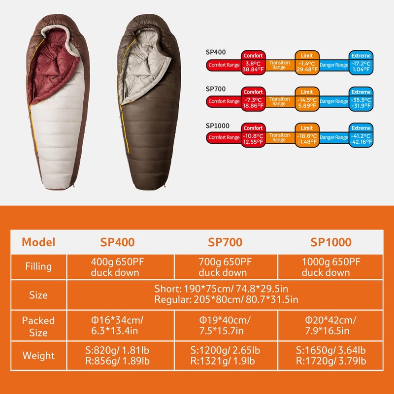 - Sizes and temperatures available: There are three models of SP400/ SP700/ SP1000 available, corresponding to the comfort temperature scale of 38.84/ 18.86/ 12.55℉ respectively. Each model is available in short and regular sizes: 74.8 x 29.5in and 80.7 x 31.5in respectively, please refer to the size pictures for the exact storage size and weight of each model. You can choose the best sleeping bag for outdoor ambient temperature