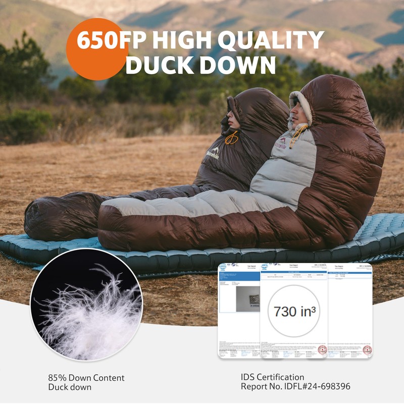 - PREMIUM RDS&IDS CERTIFIED DOWN: The new 2025 Snowbird model sleeping bags are made from traceable down and certified by RDS Professional. Each item's label can be scanned to track the origin of the down. Selected high quality 650 fluffy duck down with 85% down content and fill weights of 400/ 700/ 1000 grams respectively, and tested by IDS in the USA