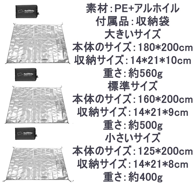 Specifications: Body size: 70.9 x 78.7 inches (180 x 200 cm) (Large), 63.0 x 78.7 inches (160 x 200 cm) (medium), 49.2 x 78.7 inches (125 x Size when stored: 14*2*10cm(large), 14*21*9cm(medium), 14*21*8cm(small). Weight: about 560g (Large), about 500g (Medium), about 400g (Small) Material: PE+Alfoil. Set Includes: Mat x 1, Storage Bag x 1.
